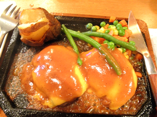 昼 : ダブルチーズハンバーグ、ライス、メロンソーダ、牛乳ブリン、水