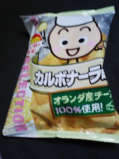 今日のつまみはカルビーのポテトチップス、カルボナーラ味