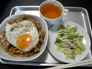 昼 : 鶏もやし丼、グリーンサラダ、ジャスミン茶