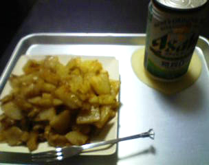夕 : じゃがいものバター醤油炒め、発泡酒(350ml×3本)、ミントリキュール(少量)、ほうじ茶
