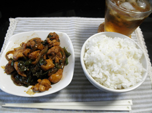 夕 : 鶏ももとピーマンの中華甘辛炒め、白米、麦茶