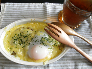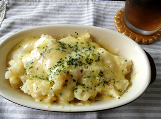 昼 : 明太じゃがチーズ焼き、麦茶