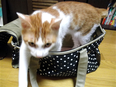 キャリー、チャック式だから閉めてる間に頭からずんずん飛び出してきちゃうんですよね^p^