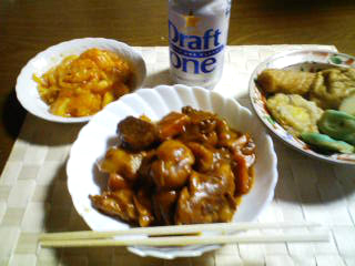 夕 : ボルシチ風、エビチリ、おでん、発泡酒(350ml)
