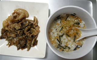 昼 : 天茶漬け、きのこと豚肉のすき煮、ほうじ茶