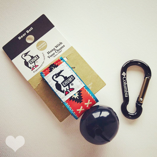 ↑チャムスの熊よけ鈴(左)とコロンビアのカラビナ