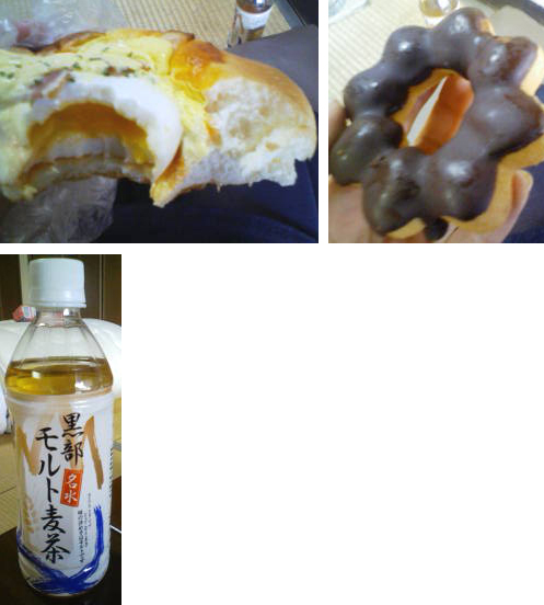 朝 : 半熟卵入りの総菜パン、ポンデリングもどき、麦茶