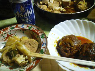 夕 : たらことネギの煮たやつ、ハンバーグ、発泡酒(350ml×3本)、餅(1個)、ほうじ茶