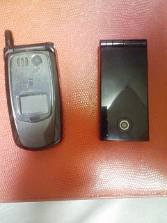 1代前の携帯(写真左)を1年ちょっとぶりに起動させて赤外線でアド移動したりしてます。