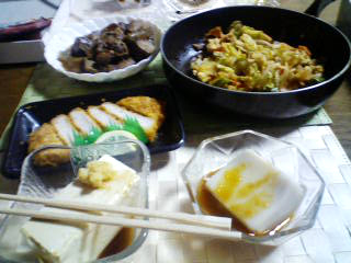 夕 : ごま豆腐、冷やっこ、キャベツの炒め物、茄子の煮物、とんかつ、麦茶