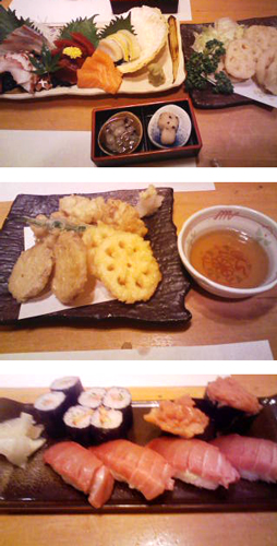 夕 : 生中(3杯)、お通し、クリームチーズとサーモンの蓮根はさみ揚げ、刺5点盛り、白子と根野菜の天ぷら、白子ポン酢、握り寿司(中トロ2貫)、軍艦巻き(明太子2貫)、ポテトフライ、マンゴーシャーベット、緑茶