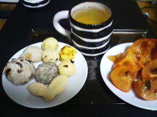 朝 : 手作りパン(みーちぇちゃんのw)、柿、緑茶