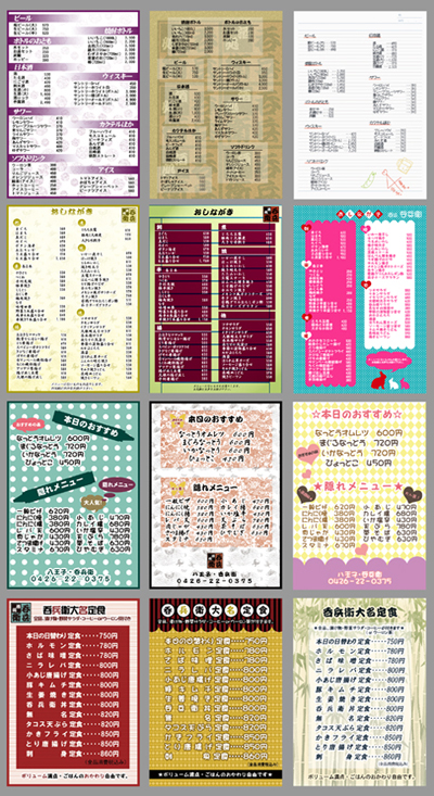 6月に個人的に引き受けた居酒屋さんのメニュー作成、今日全て納品してきました。 料金やメニューの変更や私のミスまでいろ②あり打ち合わせも何度か行きましたがあとは後日料金いただくだけです。 内容は ・総デザイン数 12種 (うち採用デザイン 9種) ・総印刷枚数 50枚 です。 上の画像がその12種です。 ほかに簡単なちらし200枚もやらせていただきました。 ↓ 今はただただホッとしてます◎ 今日はちょっといいビール飲みますよb