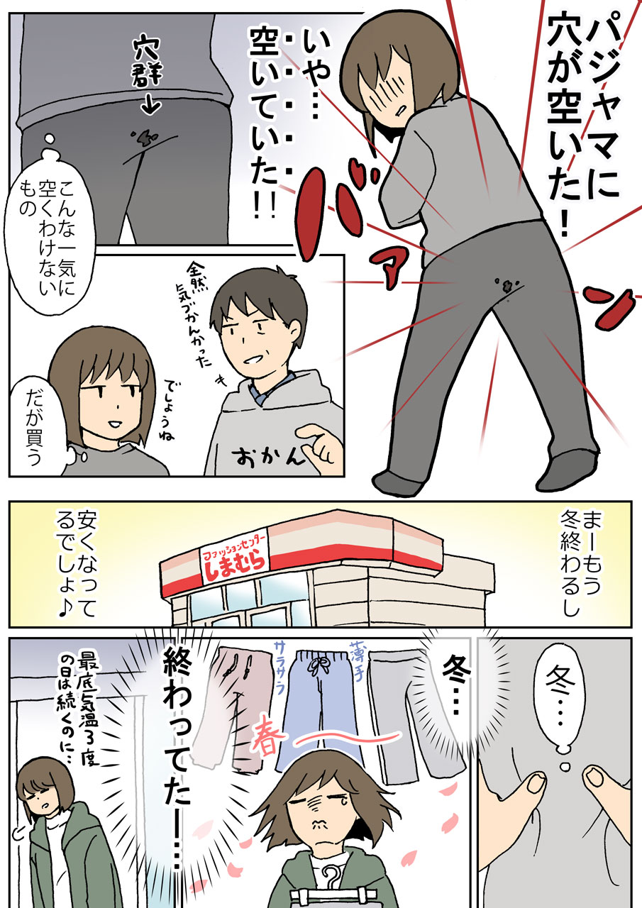 冬用のルームパンツ、2着で毎日洗ってローテーションしてましたが…まさかの代わりの物が見つからないという3月中旬。隣の市まで行ってドンキやユニクロなどに行けばあるかもですがもういいやと秋用ルームパンツで残りの寒い日を凌ごうと思います。ちなみに理想の冬用ルームパンツはこんな感じ↓