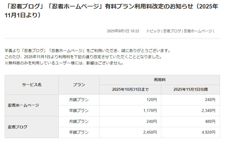 忍者ブログさんの利用料が倍になるそうです