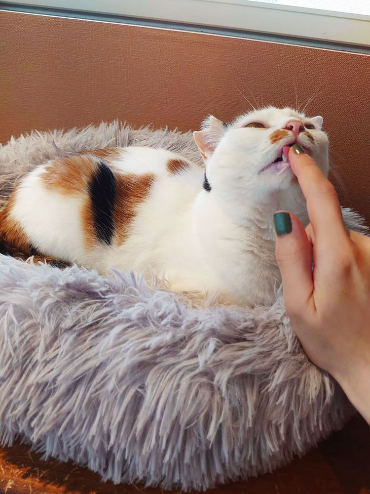 三毛猫さんはあいさつに指を差し出すとめちゃくちゃペロペロしてくれました。