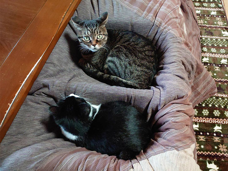 ↑前回のブログにあげた天板をずらしたこたつの上でじゃれあうもっちとゴンちゃんの動画です。