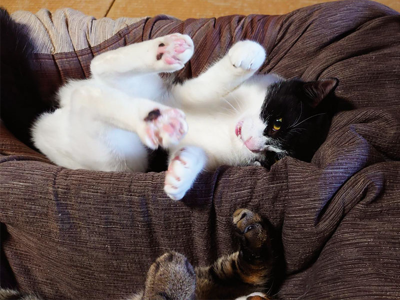 散々部屋中を2匹で走り回って追いかけっこ&取っ組み合いをした後なのでゆるーいポカスカ具合です。
