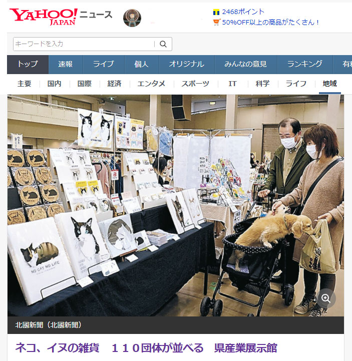 「ねこばっか+ワン2021」に出展中に通りかかったお客さんが「ここ新聞に載ってたよ」と声をかけていただいたのですが載っていたという北國新聞はうちでは取ってなかったのでLINEのタイムラインで「取ってる人いませんか?」と聞いてみたところ友達がこちらを見つけてくれました。