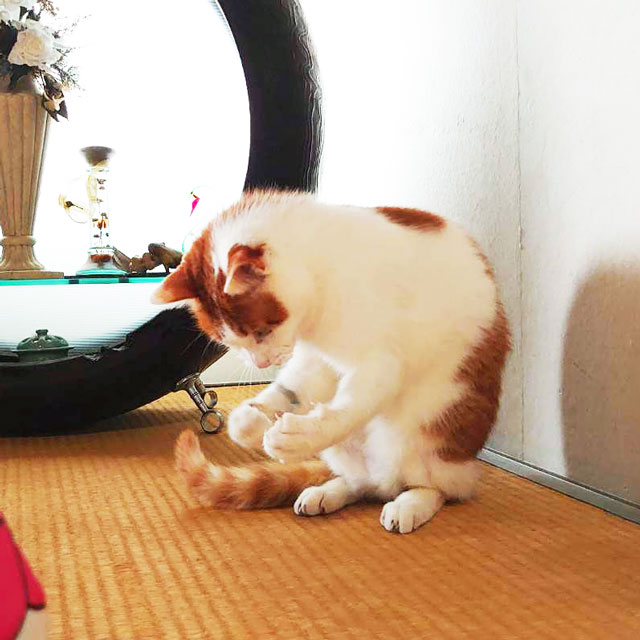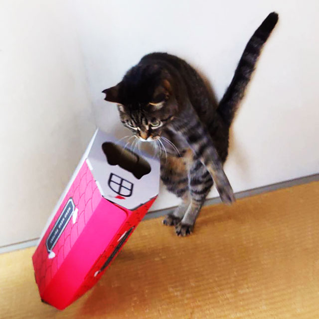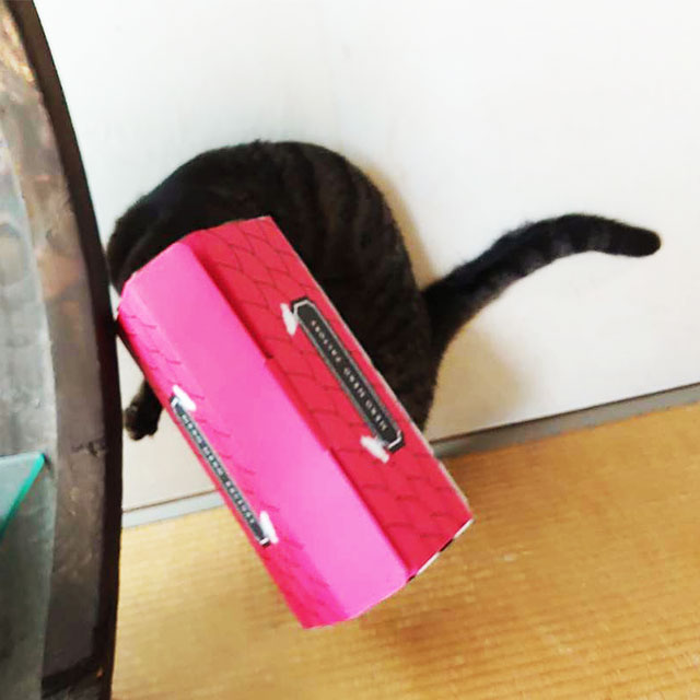 ちなみに入っていた箱「ねこねこハウス小」は窓もついていたのですがうちの太っちょちゃんには小さかったようでがっつり頭がハマって大慌てしてました。