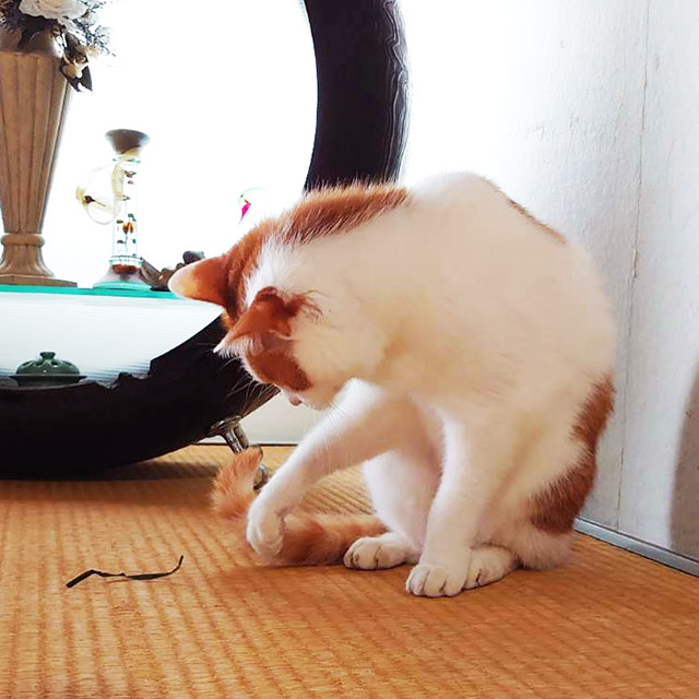ちなみにゴンちゃんと違って慎重なヨリは自分が入らなそうな箱ではなくてパンの袋を留めていた紐の方でちまちまと遊んでいました。