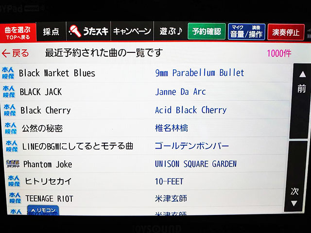 ↑最期の3曲「Black」はじまりの曲で〆た先週金曜のヒトカラのデンモクの履歴です。