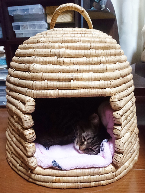 不安のせいもあるのかすごく甘えん坊で部屋に帰ってくるとこの猫ちぐらから出てきて出迎えてくれました。