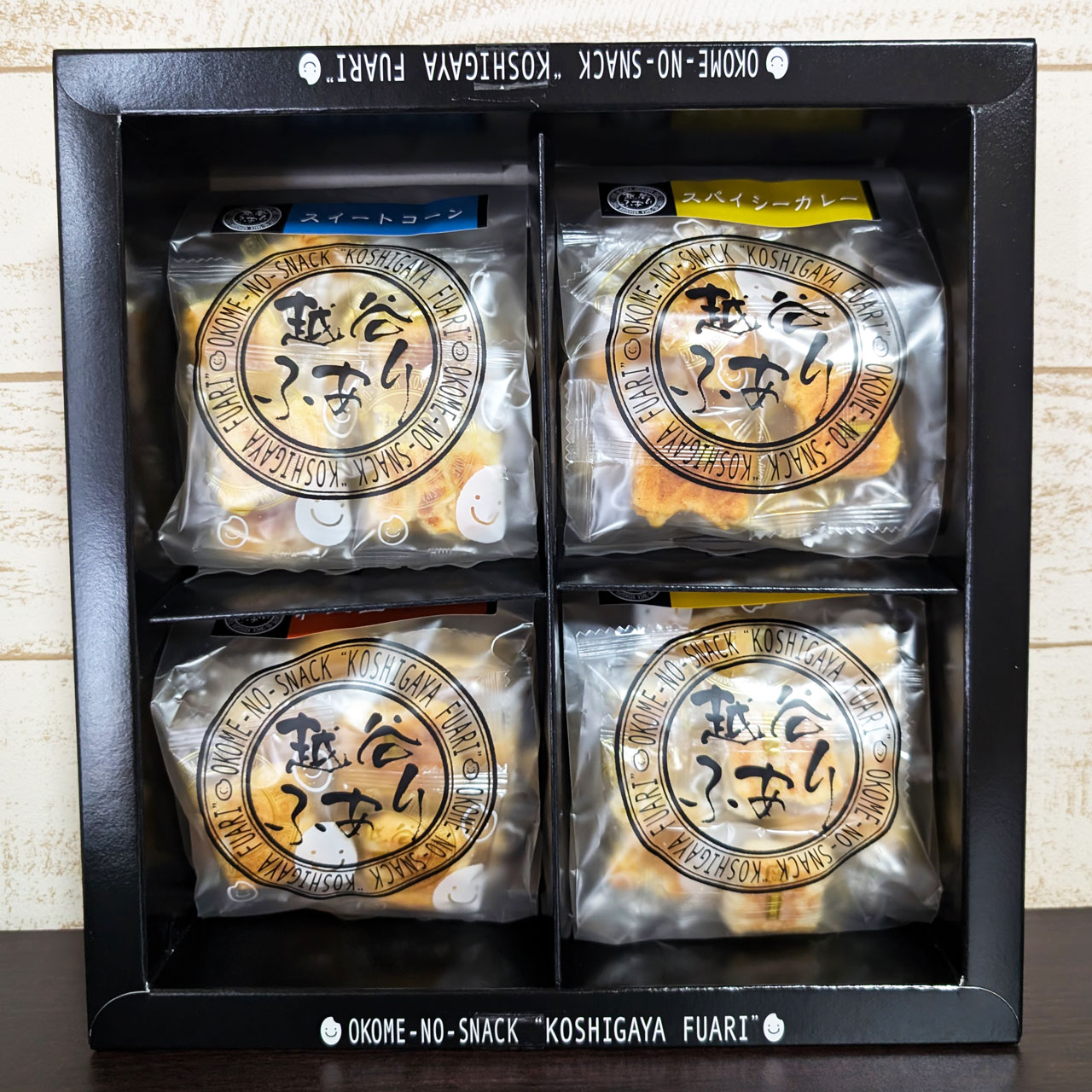 箱の中に4種類、それぞれの中身は一口サイズのおせんべい。