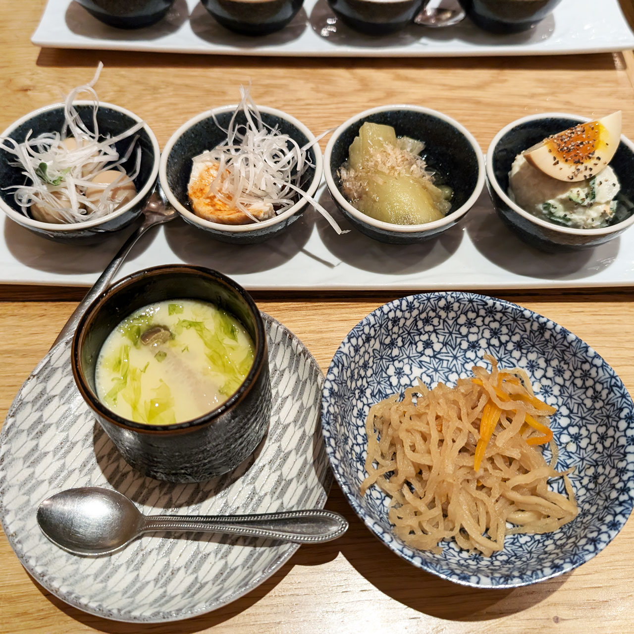 前菜の盛り合わせと単品で茄子の煮浸しを注文したら盛り合わせに茄子の煮浸しも入ってると追いえていただき「オーダー取り消しますか?」と聞いてくれたりして親切なお店だなと思いました。