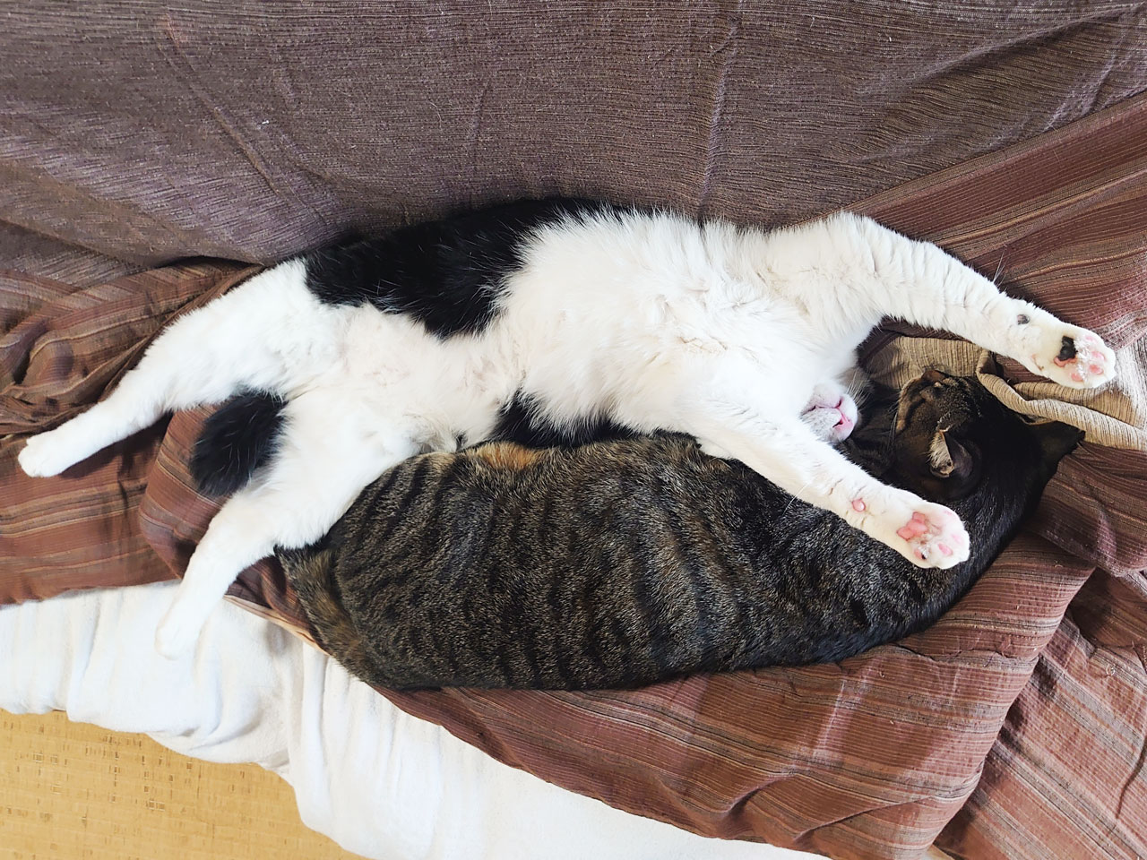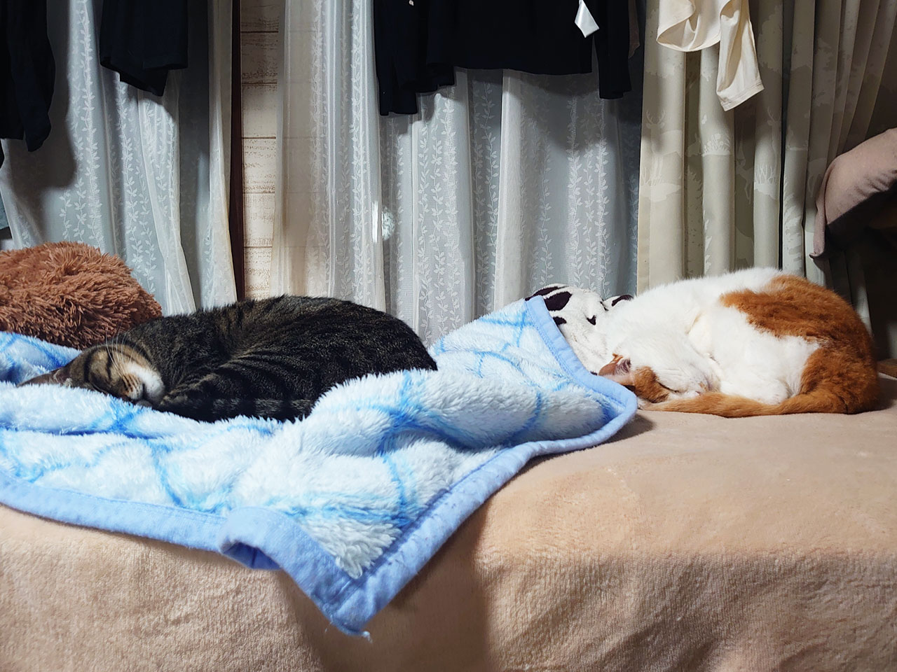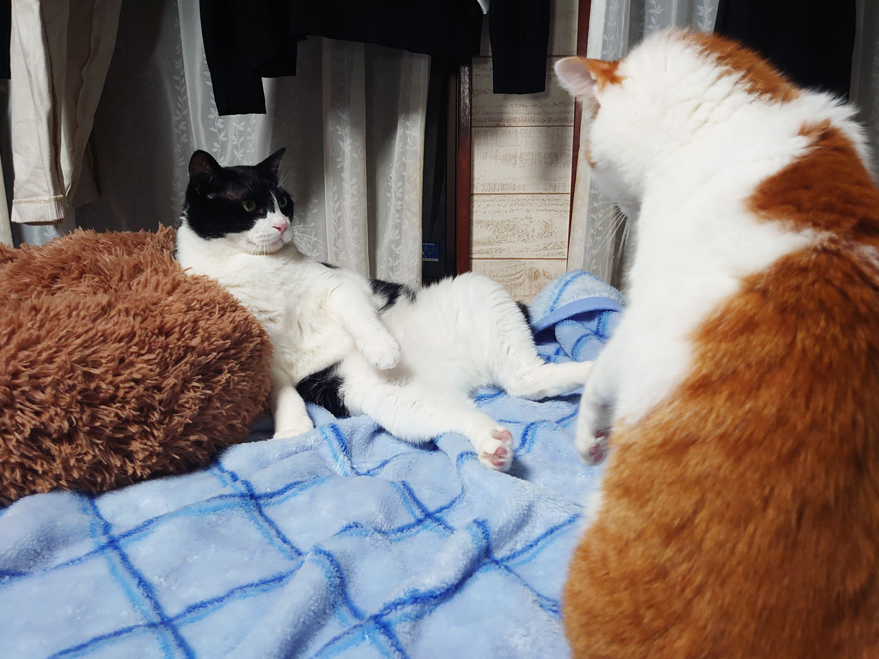 こたつの中に入らずに外でいちゃついてる?2匹を発見しました。もちおの股からごん太のしっぽがはみ出てるように見えてあの黒いのはもちおの短いしっぽです。