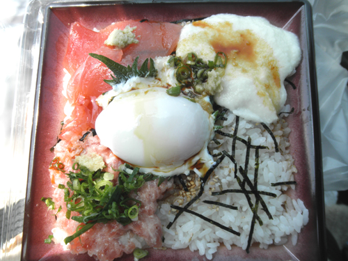 画像は移動の車の中で食べたマグロの赤身とネギトロととろろと温泉卵ののったお弁当♪