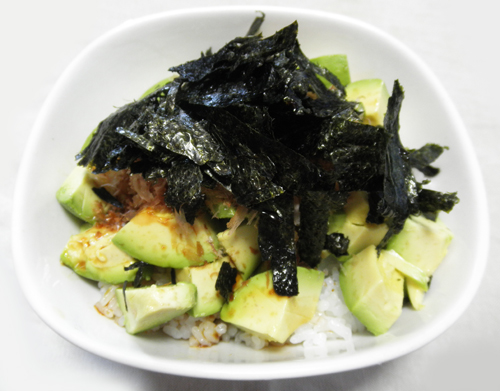 作り方はごはんなアボカドとかつお節と海苔をのせてお醤油をかけただけヽ(´ー`)ノ