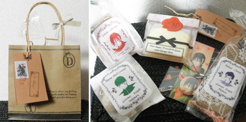 差出人がピクシブやついったで同じジャンル好きってことでお世話になってる飛羽さんからだったので慌てて夜再配達してもらって袋を開けたら中から可愛い紙袋が…っ!