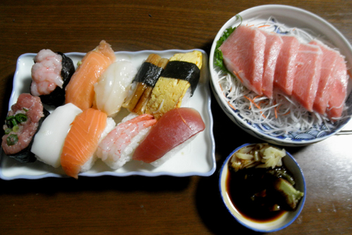 お寿司と大トロのお刺身とあとは枝豆とか。