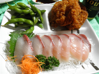 昨日の夕飯はぶりのお刺身とフライドチキン2つと枝豆とひれかつ重と黒ビール。