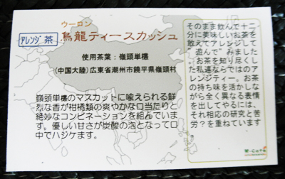頼んだ烏龍ティースカッシュの説明のついたカードも一緒に添えられてきてそういうのを見るのも楽しかったしお店の内装もアジアンテイストでいい感じでした◎