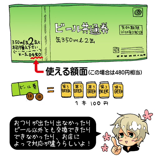 私以前に「もらったけど一度ビール飲まないからあげる」とビール券もらったことあったんですがその時は‘350ml×2本’って記載があったのでそのままコンビニでビール2本と交換してもらったんです。