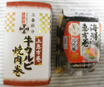 結局買いに行くの億劫で近所のファミマですが、、、 海鮮恵方巻(¥370)と牛カルビ焼肉巻(¥500)をゲット☆彡