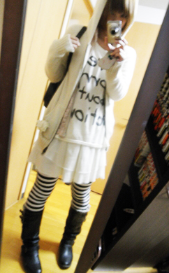 画像じゃ分かりづらいですが白のニットパーカーの下にうっすいピンク系のレースっぽいパーカー重ねてるので頭に被ってもちくちくしないしあったかいのです( ´∀`)b