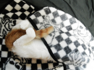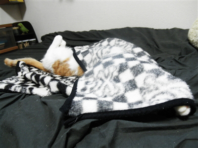 昨日寒いのでひざ掛けで全身をくるんでヨリをお昼寝させて1,2時間放置後、ふと見ると上の画像みたいなことになってましたヽ(の∀の`)ノ