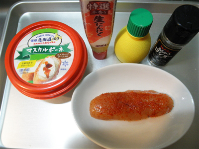 ①マスカルポーネチーズにレモン汁を2、3滴入れて柔らかくなるように混ぜます