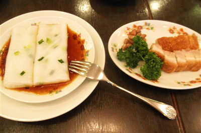 ねぎ入り蒸しクレープ、皮つき豚バラ肉の塩あぶり焼き、元祖えびのウエハース巻揚げ、