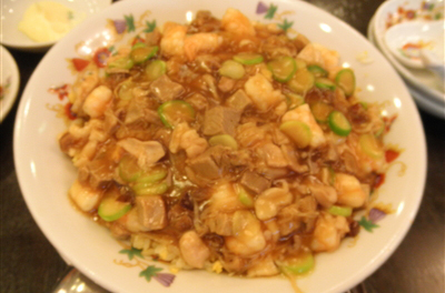 かに肉入り三色蒸しぎょうざ、特製ニラまんじゅう、福建風あんかけチャーハン、青島ビールゴールドラベル