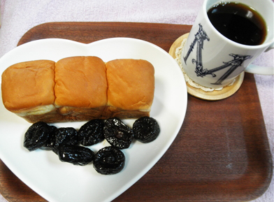 今日の朝食はレーズン入ったパンとプルーンとコーヒー☆彡