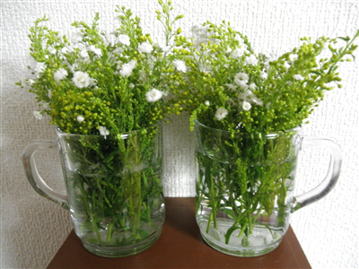 家に帰ってから花瓶なんてしゃれたものないので家中の水入れられそうなもの物色しながら活けてみましたよ(ω´∀`ω)