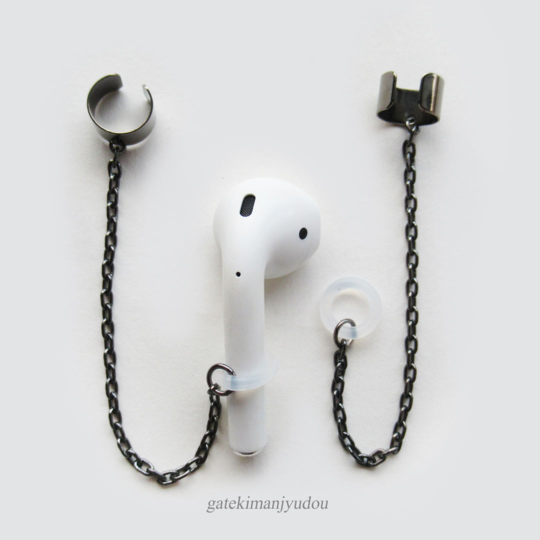 ワイヤレスイヤホンにはめる部分とイヤーカフスをチェーンで繋いだアクセサリーです。