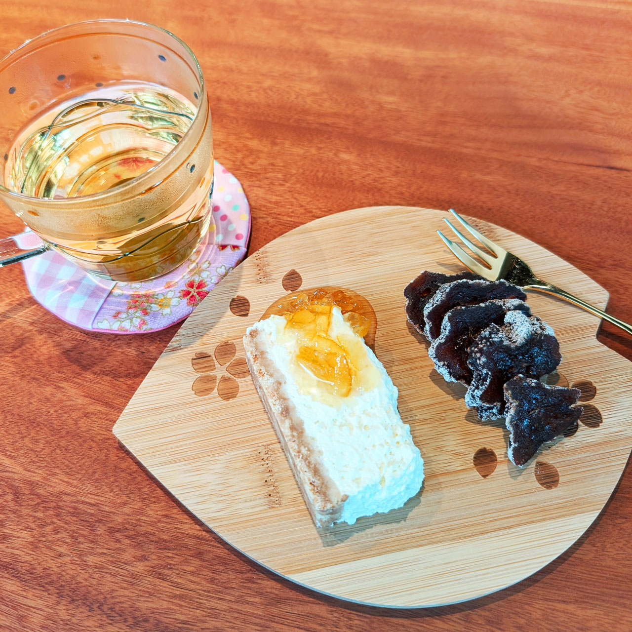 今の季節のデザートはゆずの皮の入ったソースがかかったチーズケーキと干し柿でした。