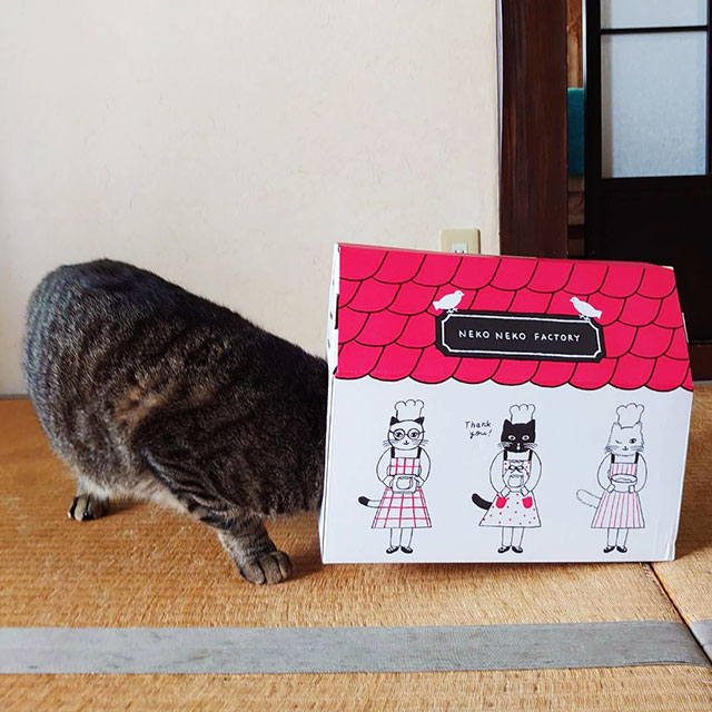 ちなみに入っていた箱「ねこねこハウス小」は窓もついていたのですがうちの太っちょちゃんには小さかったようでがっつり頭がハマって大慌てしてました。
