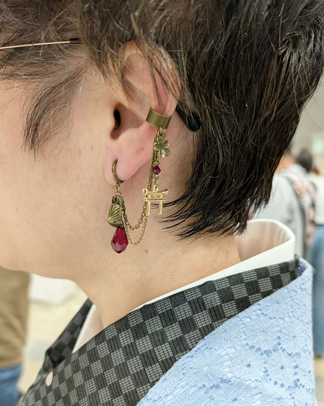 イヤーカフ部分に本来桜が2つついていたのですがその一つを単品で販売していた鳥居のイヤーカフの鳥居をつけて欲しいとオーダーをいただきその場でお直し