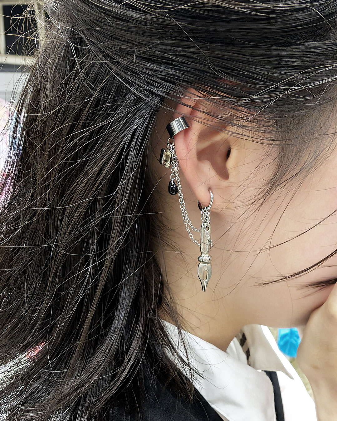 こちらは以前お迎えをしていただいた「ペン先と本のフープイヤリング&イヤーカフ」をつけて来てくださったもの